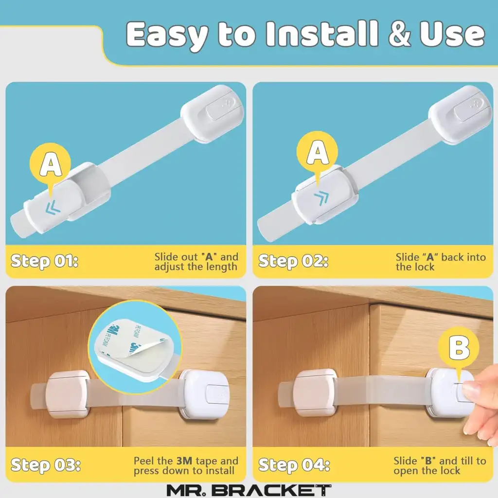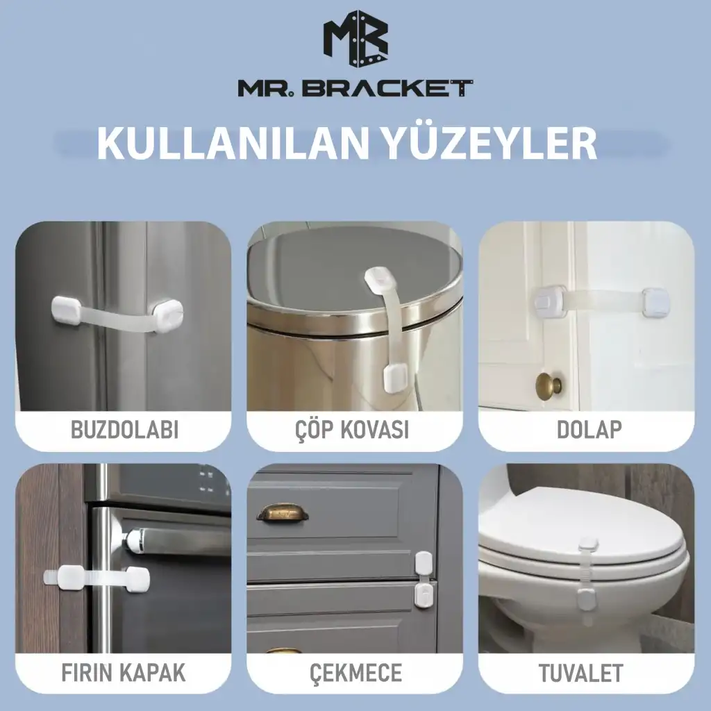 Piyasadaki ucuz güvenlik kilitleriyle karıştırmayınız. Yapışkanları 3M markadır ve söküldüğünde mobilyanız da iz bırakmaz.