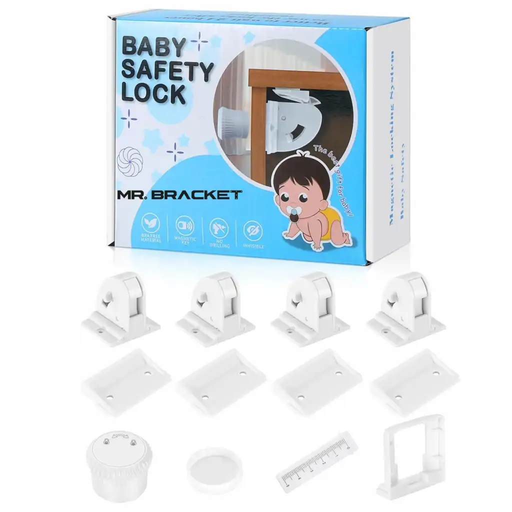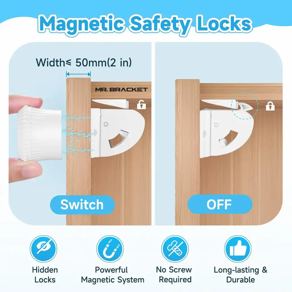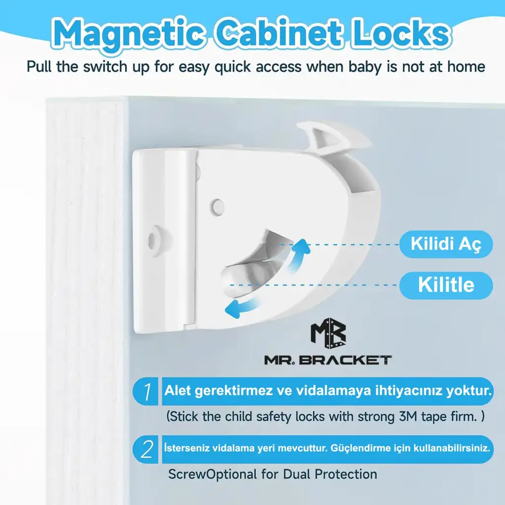 Bebeklerin ve çocukların güvenliğini sağlamak amacıyla tasarlanmış, dört adet manyetik kilitle donatılmış dolap ve çekmece kilitleri.